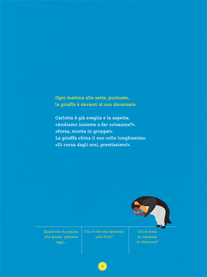 CI PIACE PERCHÉ: l’aggiunta deliziosa delle piccole missioni in calce ad ogni pagina. Richiedono attenzione e concentrazione ai bambini, che dovranno esplorare minuziosamente l’illustrazione per riconoscere i dettagli richiesti nella consegna.