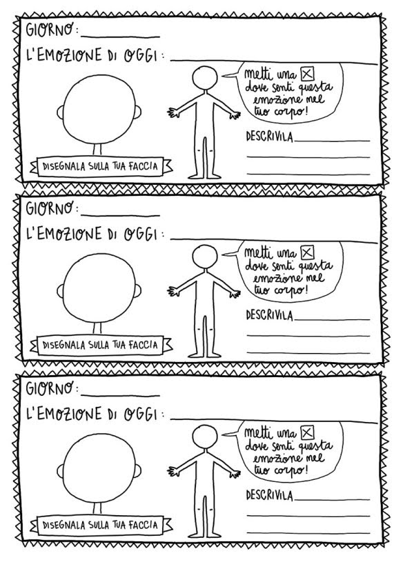 Il quaderno si apre con un diario delle emozioni: per 30 giorni il bambino dovrà annotare l’emozione più importante della giornata, descrivendola a parole, indicando con una X la parte del corpo in cui l’ha sentita e rappresentandola su una faccia.