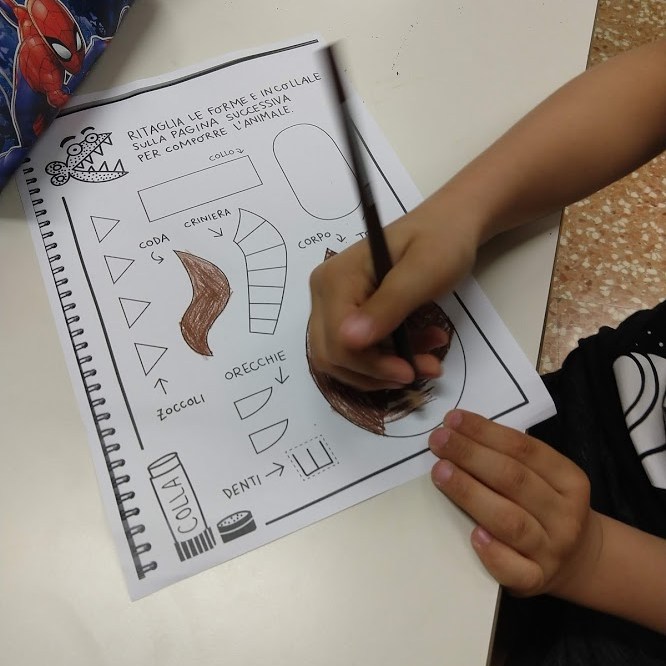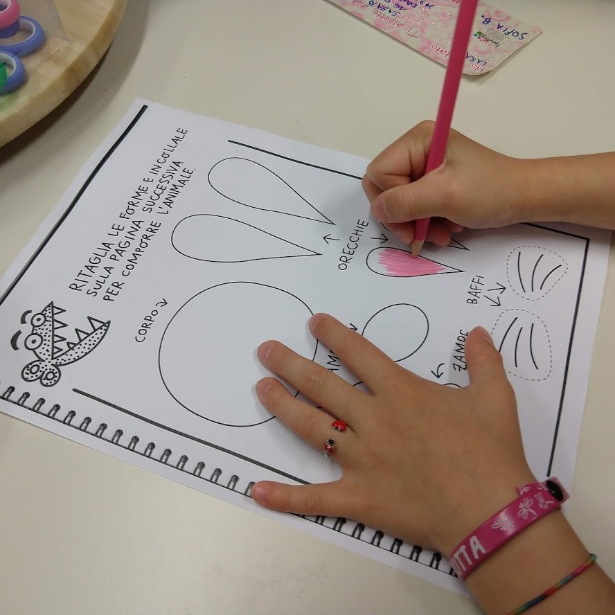 Ciascun animale è infatti stato scomposto in forme geometriche semplici come cerchi, ellissi, rettangoli, etc. Le forme vanno ritagliate e incollate su una apposita pagina. Si può ricomporre la figura in tanti modi, seguendo il disegno originale oppure no, e infine si colora.