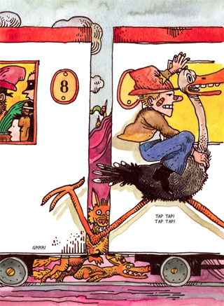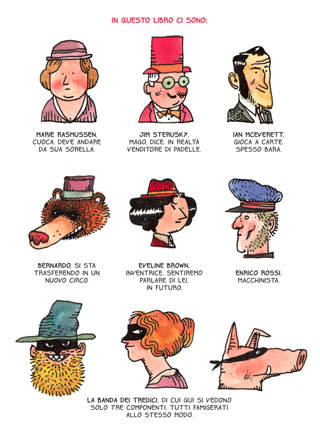 LA TRAMA Un bambino in viaggio in treno con la zia incontra una moltitudine di curiosi personaggi: il macchinista, un mago che in realtà è un venditore di padelle, un’inventrice, l’orso Bernardo che si sta trasferendo in nuovo circo, Pete che ha appena avuto una delusione d’amore, un baro… e la Banda dei Tredici, famigerati furfanti che vogliono assaltare il treno. Per fortuna interviene lo sceriffo che prova in tutti i modi ad arrestarli, cade da cavallo, riappare in sella ad uno struzzo e nuovamente su un cavallo, sì ma di una giovane indiana. Spassosissimo! Alla fine il treno arriva in orario e trovano spazio le divertenti riflessioni conclusive dei personaggi.