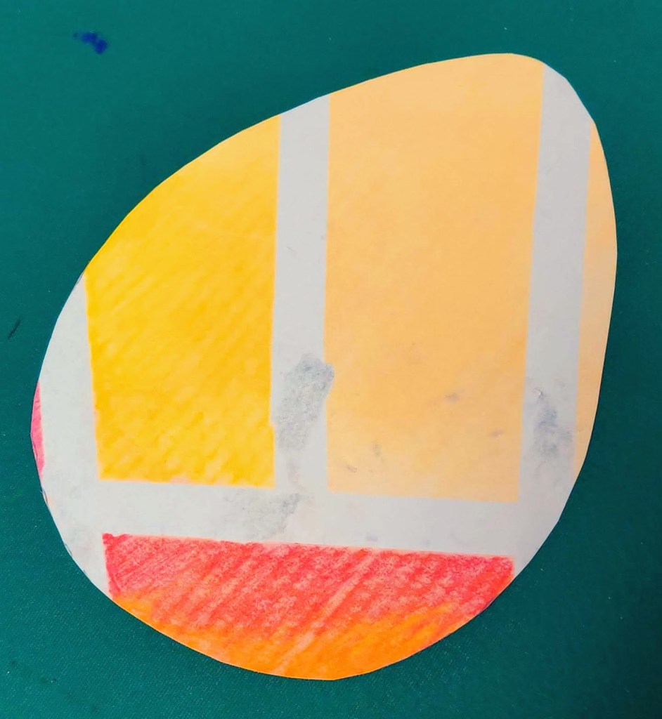 SECONDA FASE: rimuovere le strisce di nastro adesivo e ritagliare la forma dell’uovo. Ovviamente si possono ritagliare uova, fiori, coniglietti e qualunque altra forma vi suggerisca la fantasia!
