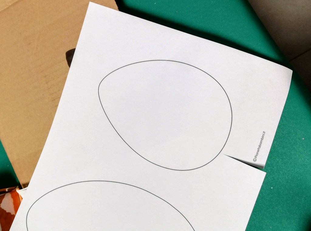 PRIMA FASE: stampare delle sagome di uova della grandezza desiderata (se non avete la possibilità di stampare sarà sufficiente disegnarle su un foglio bianco) e ritagliarle. Noi abbiamo usato quelle di Pianeta bambini (https://pianetabambini.it/sagome-disegni-uova-pasqua-stampare-colorare/)