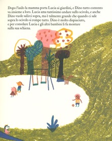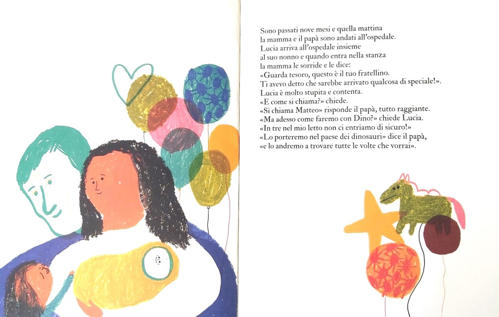 Passati nove mesi Lucia va all’ospedale a trovare la mamma e conosce il suo fratellino Matteo. Che fine farà Dino? Il papà la rassicura: accompagneranno Dino nel paese dei dinosauri, dove potranno andare a trovarlo quando vorranno.