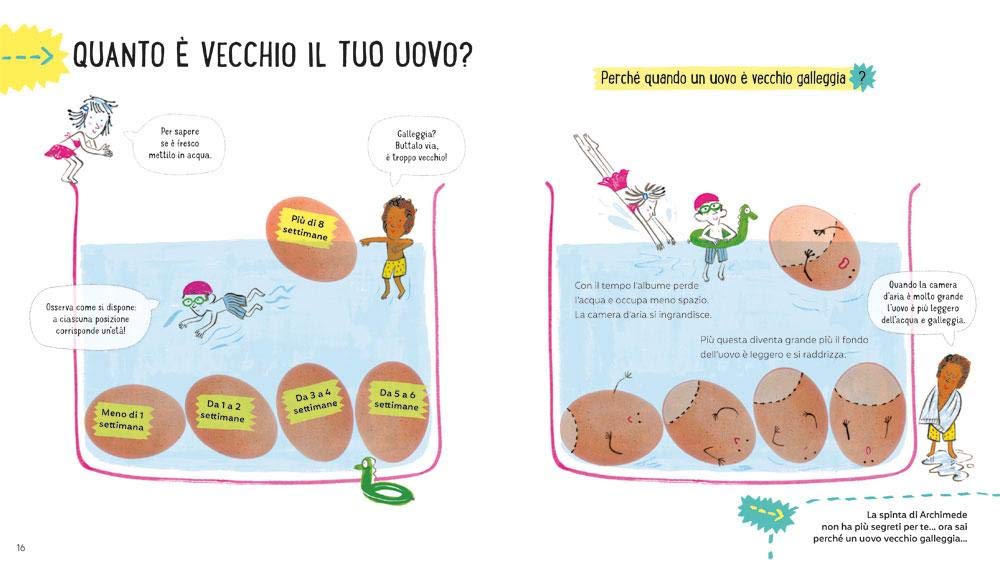 I volumi procedono per domande-stimolo, curiose affermazioni, inviti a testare alcuni fenomeni, e proseguono illustrando dettagliatamente gli esperimenti guidando il bambino nel ragionamento induttivo fino a condurlo alla spiegazione scientifica. E così anche i piccoli potranno scoprire quando è vecchio un uovo, renderne elastico il guscio ma anche comprendere il significato di emulsione stabile/instabile facendo la maionese!