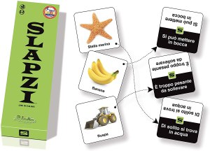 SLAPZI: Ogni giocatore ha 5 carte, dunque 10 immagini fotografiche (fronte/retro). Lo scopo del gioco è quello di essere il primo a liberarsi di tutte le 5 carte. Per giocare una carta bisogna essere i primi a mettere in campo la propria carta-immagine che rispetti l’indizio girato al centro del tavolo.