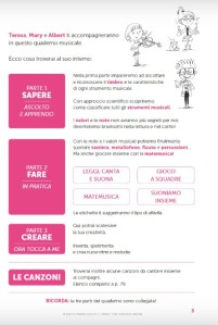PERCHE’ CI PIACE: per l’attenzione che è stata data all’interdisciplinarità: la proposte coinvolgono italiano, matematica e scienze, ma anche storia, arte, inglese ed educazione fisica. Ogni volume è suddiviso in 3 parti (sapere, fare, creare) che guidano l’allievo dalla scoperta, all’apprendimento fino alla rielaborazione creativa. Se perplimesse la spesa che dovrebbe sostenere la famiglia (ogni alunno deve avere il proprio volume per esercitarsi a scuola e a casa), pensate che al costo di 12-15 euro non trovereste un esperto che porti avanti un percorso musicale annuale, perciò vi consigliamo di farci un pensierino!