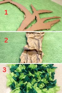 Materiale necessario: cartone, carta leggera marrone, cartellone bianco o verde, carta velina verde chiaro e scuro, colla.