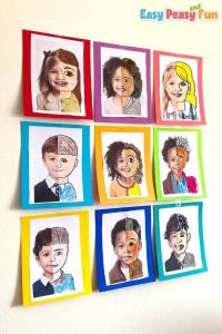2. Chiedi ai bambini di analizzare i propri volti e quelli dei compagni per identificare proporzioni e simmetrie (es. distanza tra occhi, larghezza del naso, ecc.). Ideale far scattare una foto e stamparle.