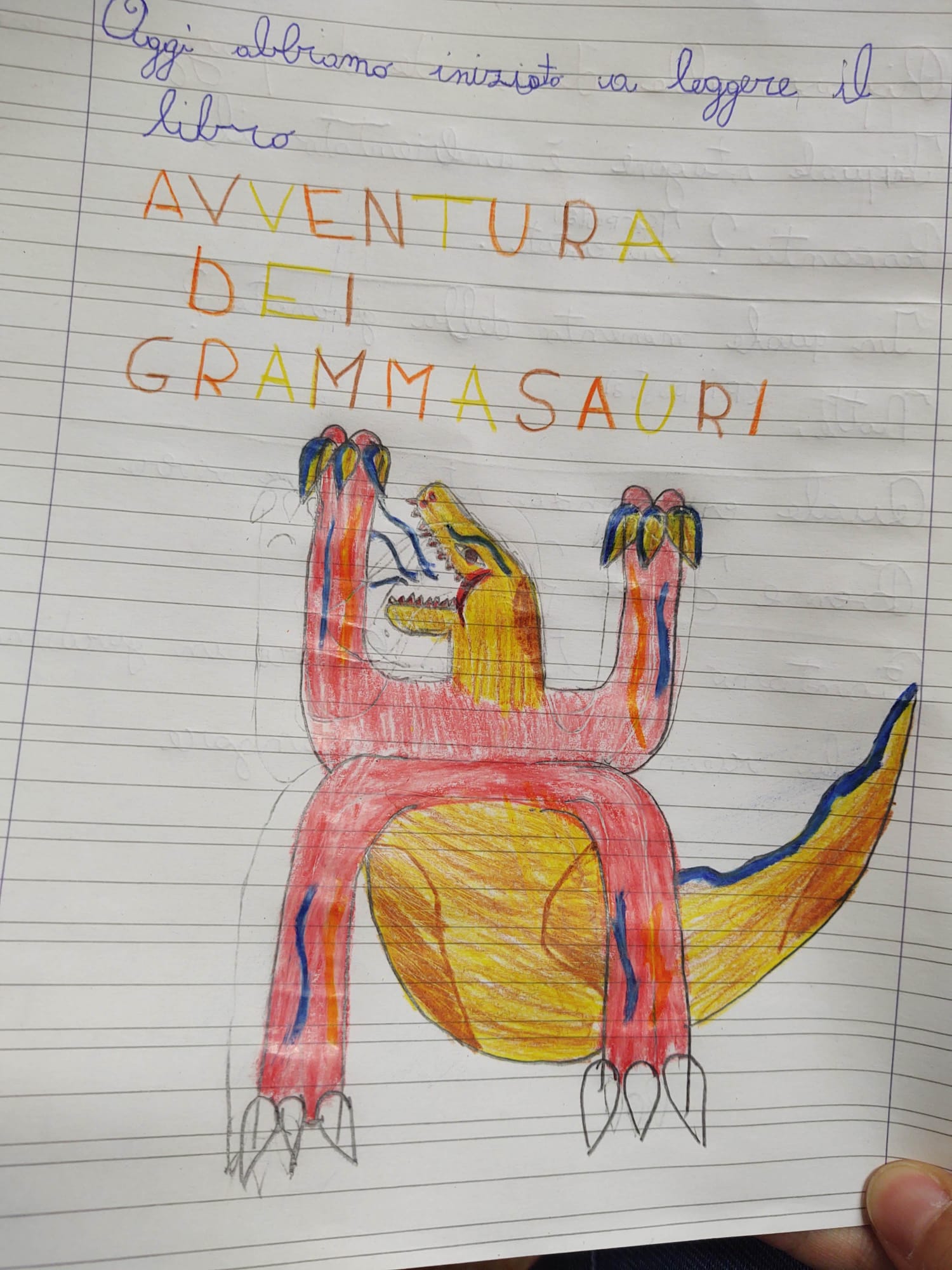 NELLA DIDATTICA: La storia, super coinvolgente e divertente, (vi garantiamo che sentirete in coro i bambini chiedervi di leggerne un capitolo dietro l’altro) è intervallata da semplici esercizi per imparare e consolidare le principali regole di ortografia della lingua italiana, quali ad esempio le doppie, l’uso dell’h, ecc. Noi abbiamo fatto seguire alla lettura di ogni capitolo gli esercizi proposti dall’autore in forma scritta (copiandoli dalla lavagna, proiettandoli tramite un’immagine del libro sulla lim, riscrivendoli al pc e proponendoli ai bambini come attività di consolidamento). Abbiamo volutamente proposto la lettura del libro nel primo quadrimestre della classe terza, parallelamente allo studio dei dinosauri in Storia e proponendo attività di Immagine/Musica/Tecnologia sempre a tema dinosauri.