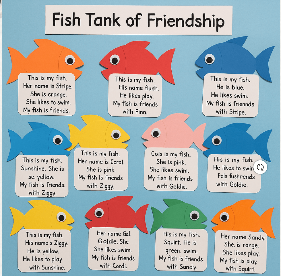 “This is my fish. His name is Bubbles. He is blue and yellow. He likes to swim and play with his friends.”