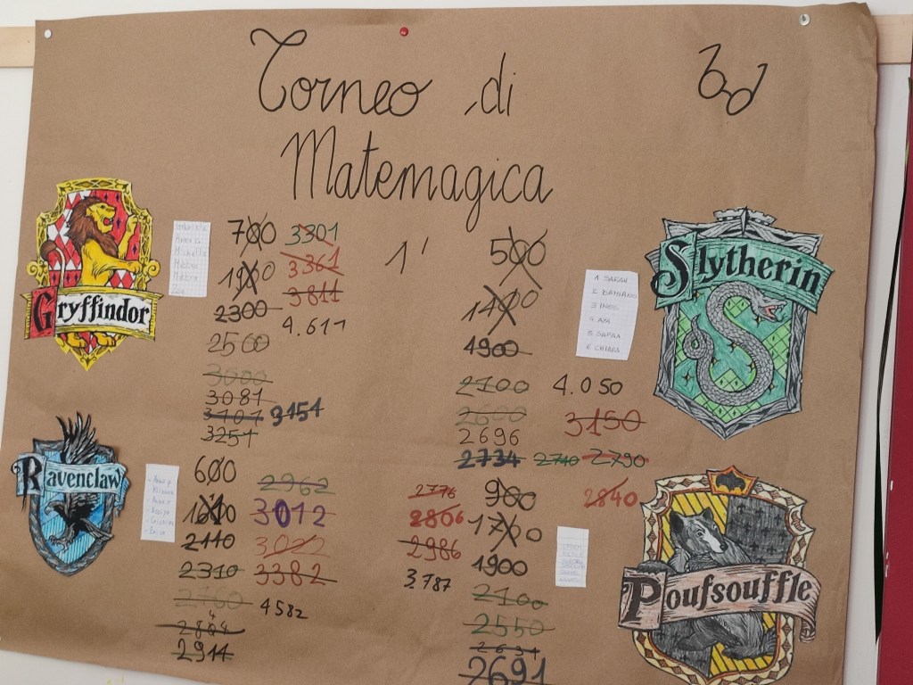 MATEMATICA: dividiamo i bambini in quattro gruppi, uno per casata. Assegniamo una missione (noi abbiamo creato una scheda con 4 attività, dai problemi ai calcoli, passando per la logica) e attribuiamo un valore per ogni missione. Ad esempio: primo gruppo a concludere 400 punti, secondo 300 e così via.