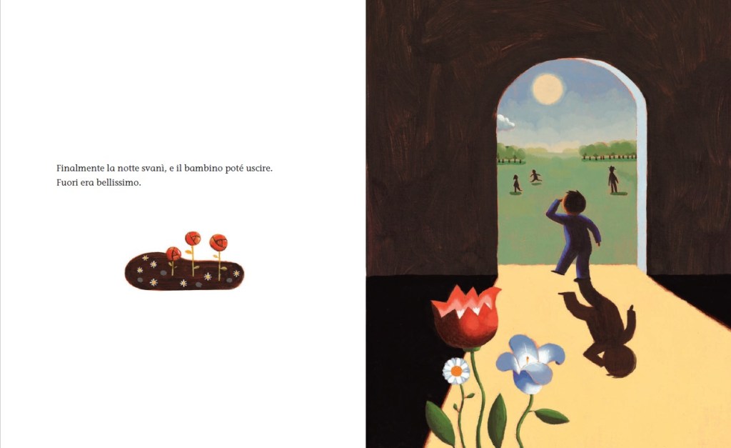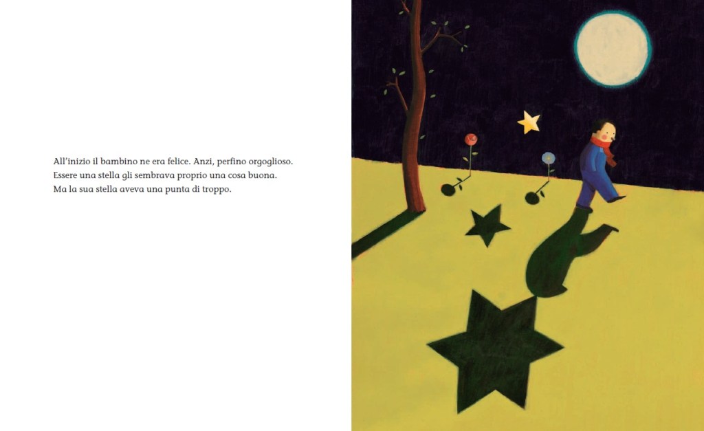 Intorno a lui ci sono altre stelle, che tremano e scompaiono nella notte. Il bambino allora spegne la sua luce, si nasconde, aspetta che il buio passi. Finché un giorno la notte finisce, il cielo cambia e lui può tornare alla luce.