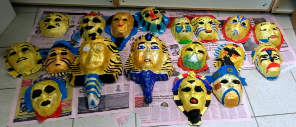I bambini hanno lavorato con cartoncino, tempera e materiali di recupero, creando maschere ispirate all’arte dell’antico Egitto. Ciascuna classe può adattare il tema alla programmazione specifica (ad esempio i dinosauri in terza!)